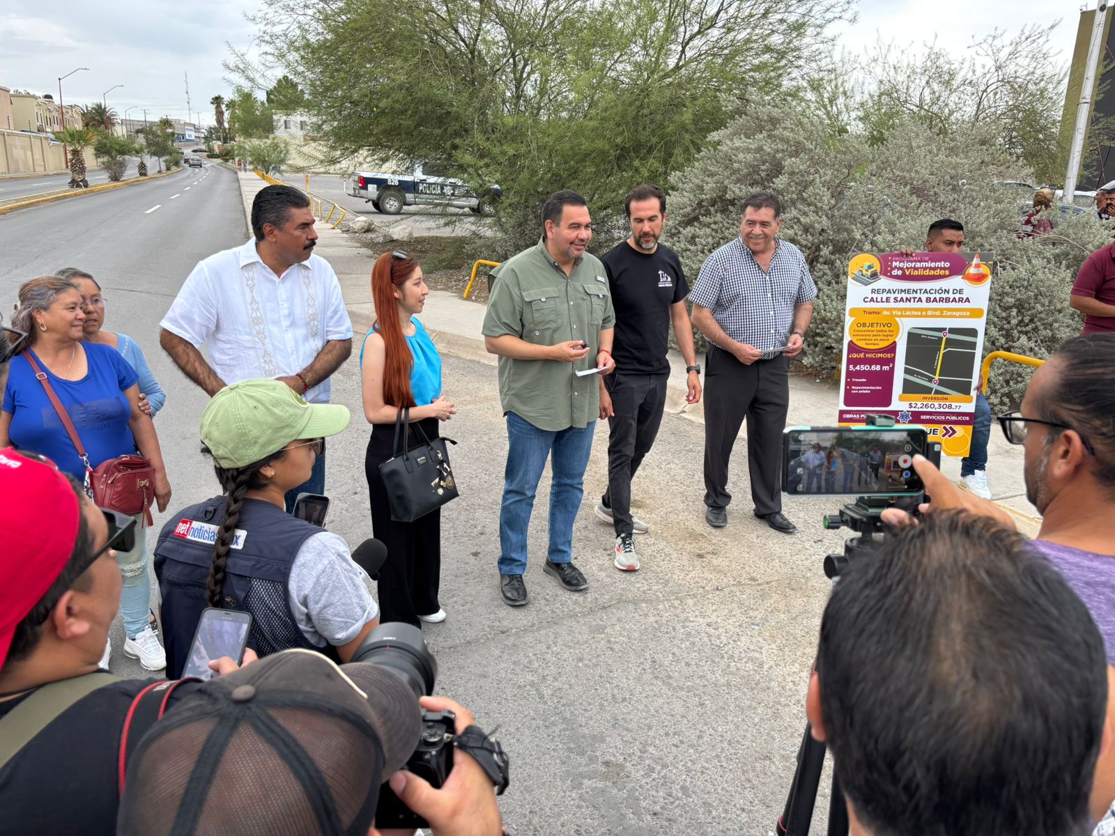 Este sábado el presidente municipal Cruz Pérez Cuéllar encabezó la entrega de la obra de repavimentación de la calle Santa Bárbara, que conecta el bulevar Zaragoza con la avenida Vía Láctea, como parte del Programa de Mejoramiento de Vialidades.