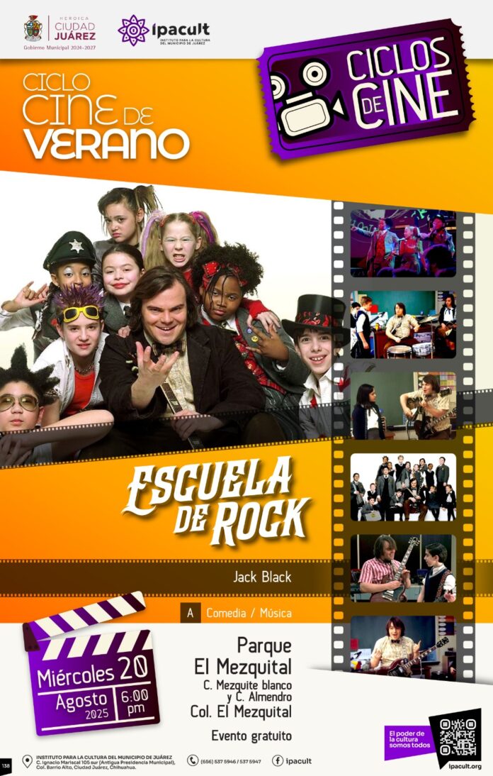 El programa Ciclos de Cine de Verano del Instituto para la Cultura del Municipio de Juárez (IPACULT) continúa su recorrido por la ciudad y este miércoles 20 de agosto llevará a la colonia El Mezquital la divertida y energética película Escuela de Rock.