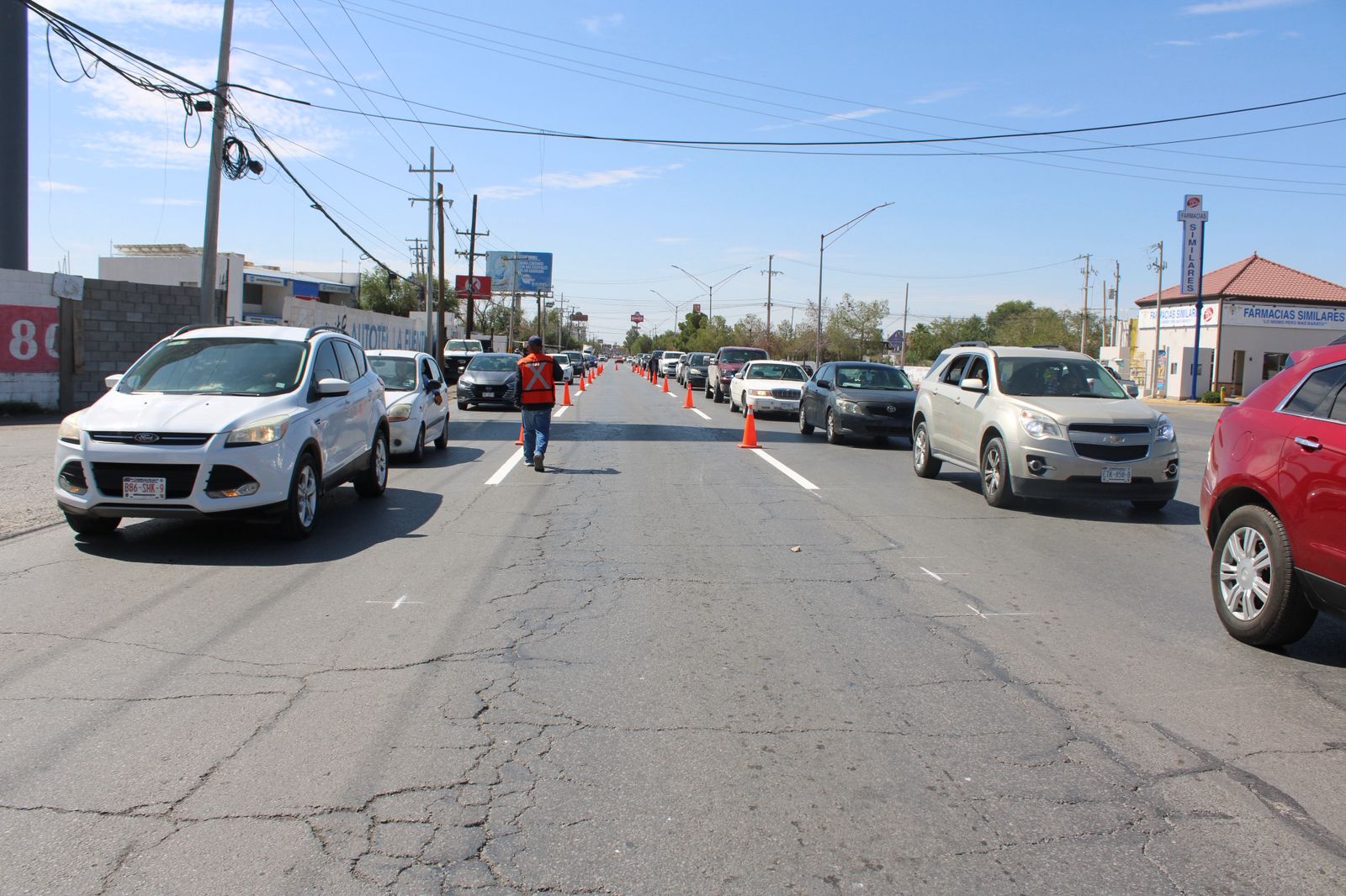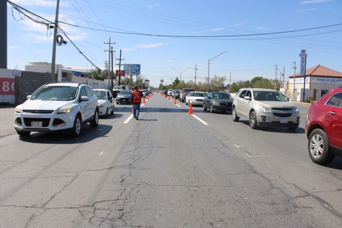 La Coordinación General de Seguridad Vial, por medio de una cuadrilla de personal del área de Control de Tráfico, delimitó la señalización horizontal sobre la avenida Rafael Pérez Serna, desde la Paseo Triunfo de la República hasta la avenida Hermanos Escobar.