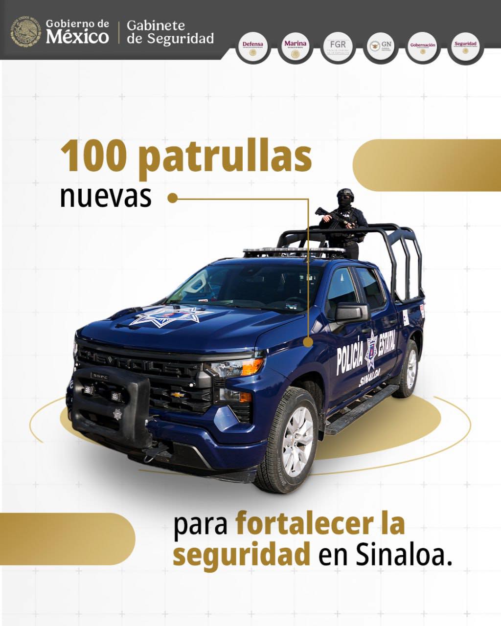 Además, el secretario de Seguridad, Omar García Harfuch, anunció la entrega de 100 patrullas que se destinarán principalmente a Culiacán, como parte de las acciones ordenadas por la presidenta Claudia Sheinbaum para reforzar la presencia policial.