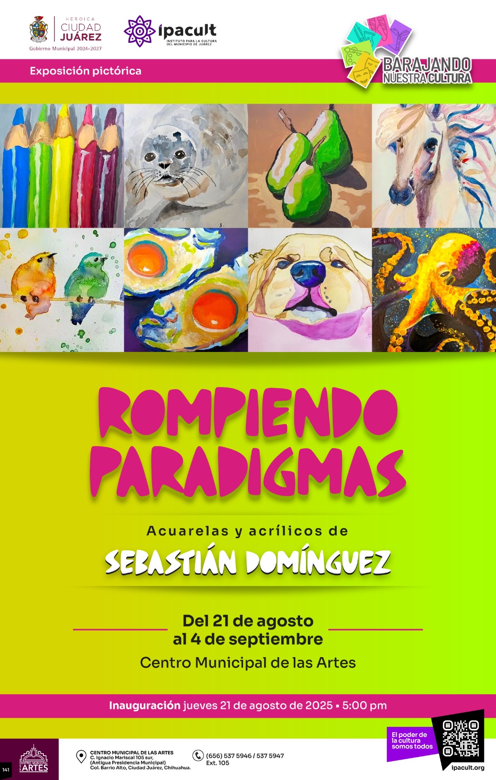El Instituto para la Cultura del Municipio de Juárez (IPACULT) invita a la ciudadanía a la inauguración de la exposición pictórica “Rompiendo paradigmas”, del joven artista infantil Sebastián Domínguez, que tendrá lugar el próximo jueves 21 de agosto a las 5:00 de la tarde en el Centro Municipal de las Artes (CMA).