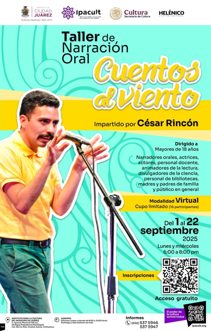 El arte de contar historias llegará a los hogares juarenses a través del taller gratuito de narración oral “Cuentos al viento”, que el Instituto para la Cultura del Municipio de Juárez (IPACULT) ofrecerá de manera virtual del 1 al 22 de septiembre, en un horario de 6:00 a 8:00 de la tarde.