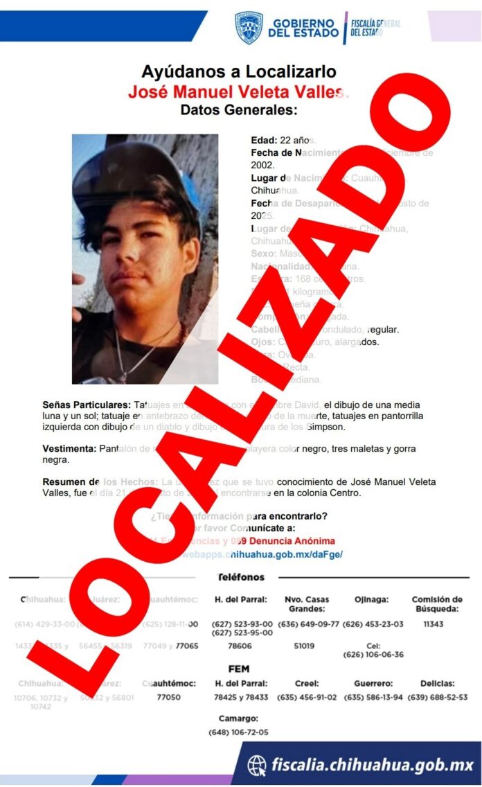 La Unidad de Investigación de Personas Ausentes y/o No Localizadas de la Fiscalía de Distrito Zona Centro (FDZC) localizó sano y salvo a José Manuel V. V., de 22 años de edad, quien contaba con reporte de ausencia interpuesto el pasado lunes, en la ciudad de Chihuahua.