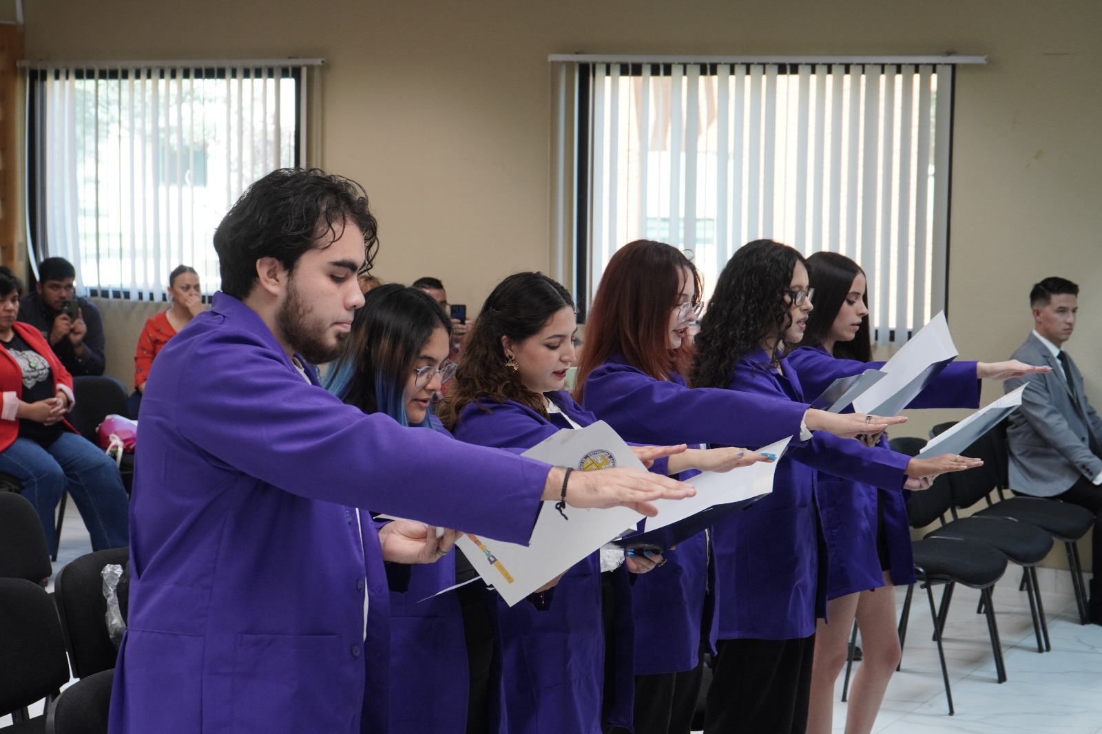Familiares y amigos de los estudiantes se hicieron presentes para ser testigos de su toma de protesta, la cual estuvo encabezada por la maestra Priscila Portillo Aguirre, coordinadora de la licenciatura en psicología y la maestra Nora Loreto Quintana.