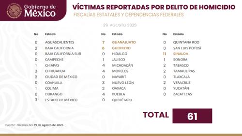 La Comisión Nacional de Seguridad (CNS) emitió su reporte oficial diario de homicidios, del día viernes 29 de agosto, con un total acumulado de 61 casos en todo México.