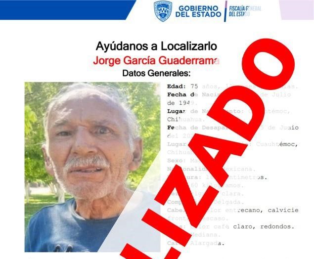 La Fiscalía de Distrito Zona Occidente, a través de la Unidad de Investigación de Personas Desaparecidas y/o Ausentes, localizó salvo y salvo a Jorge G. G., persona de 75 años edad, que era buscada en calidad de desparecida desde que se ausento de su domicilio el 05 de junio del 2025, en el municipio de Cuauhtémoc.