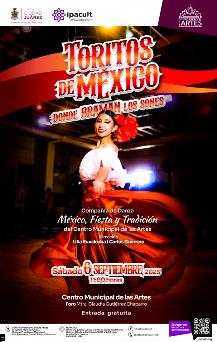 El Instituto para la Cultura del Municipio de Juárez (IPACULT) invita a la comunidad juarense a disfrutar este sábado 6 de septiembre del espectáculo “Toritos de México: donde braman los sones”, que será presentado en el Foro Mtra. Claudia Gutiérrez Chaparro del Centro Municipal de las Artes (CMA).