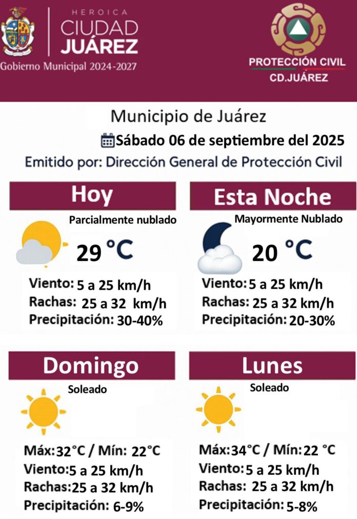 La Dirección General de Protección Civil del Municipio de Juárez informó sobre las condiciones meteorológicas para este sábado 6 de septiembre de 2025 y los próximos días.
