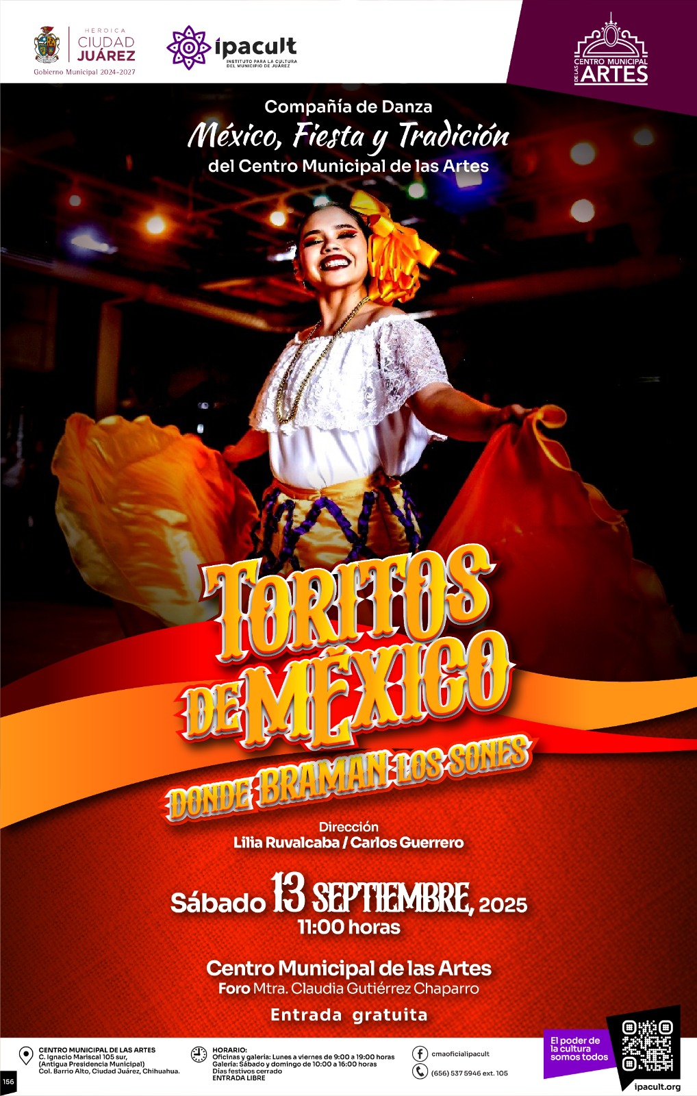 El folclor y la fiesta se harán presentes este fin de semana en Ciudad Juárez con el espectáculo “Toritos de México: Donde braman los sones”, que se presentará mañana sábado 13 a las 11:00 de la mañana en el foro “Maestra Claudia Gutiérrez Chaparro” del Centro Municipal de las Artes (CMA).