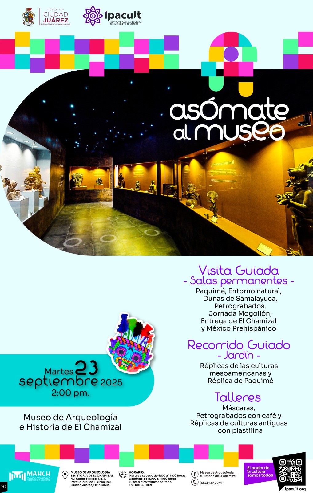 La visita comenzará a las 2:00 de la tarde e incluirá un recorrido guiado por las salas permanentes del recinto, donde los estudiantes podrán conocer exposiciones emblemáticas como Paquimé, Entorno Natural, Dunas de Samalayuca, Petrograbados y Jornada Mogollón.
