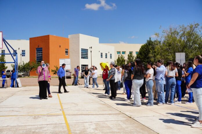 Estudiantes, docentes y personal administrativo de la UACJ Campus Nuevo Casas Grandes participaron en el Simulacro Nacional 2025, este viernes 19 de septiembre al mediodía.