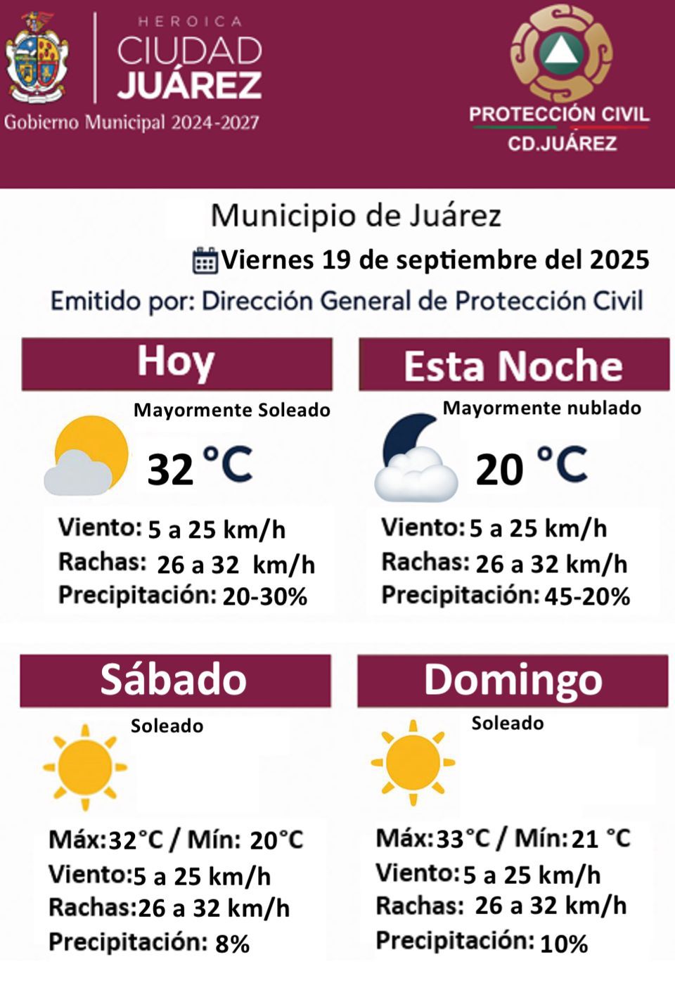 La Dirección General de Protección Civil del Municipio de Juárez informó el pronóstico del clima correspondiente a este fin de semana. Para este viernes 19 de septiembre se espera un día mayormente soleado con una temperatura máxima de 32 grados centígrados, vientos de 5 a 25 kilómetros por hora y rachas de 26 a 32 kilómetros por hora, así como una probabilidad de precipitación de entre 20 y 30 por ciento. Por la noche el cielo se mantendrá mayormente nublado con una temperatura mínima de 20 grados centígrados, viento similar al del día y una probabilidad de lluvias que oscilará entre el 20 y 45 por ciento.