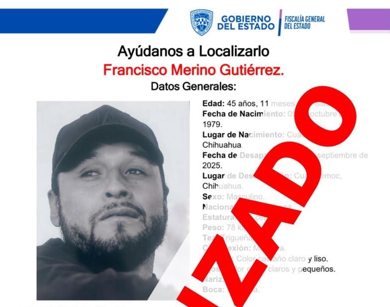 En el primer caso, se localizó en buenas condiciones físicas, a Rodrigo M. F., de 40 años de edad, quien salió de su domicilio el pasado 10 de septiembre del 2025 luego de irse a trabajar en una huerta en Bachíniva.