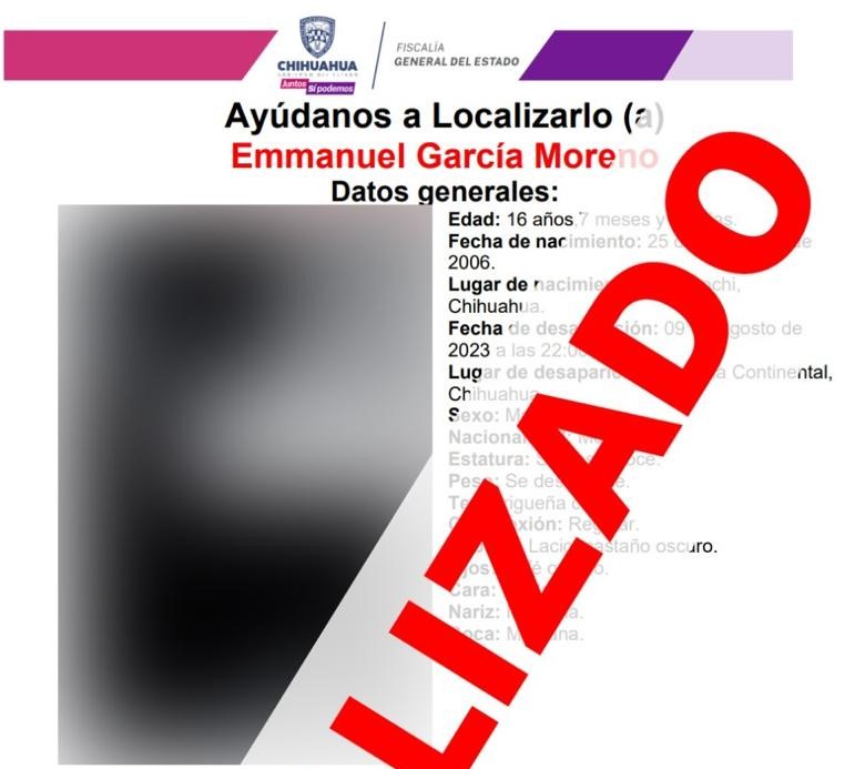 La Unidad de Investigación de Personas Ausentes y/o No Localizadas de la Fiscalía de Distrito Zona Centro (FDZC) localizó sano y salvo a Emmanuel G.M., de 18 años de edad, quien contaba con reporte de ausencia interpuesto en la ciudad de Chihuahua.