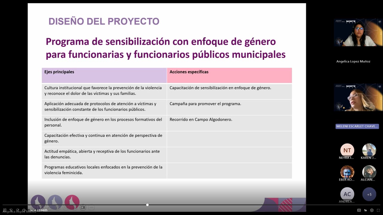 Los proyectos presentados fueron: Investigación e intervención con perspectiva de género: claves para la enfrentar las violencias de género desde lo local, elaborado por la encargada de Investigación, Angélica López; Procesos de sensibilización institucional para abordar la violencia feminicida y la desaparición en Ciudad Juárez, por Melenei Chávez; Proceso de creación de recursos didácticos sobre feminicidios para la sensibilización del funcionariado público municipal, a cargo de Karen Favela; y Diagnóstico sobre la situación de la violencia contra las adolescencias en el ámbito escolar y digital en Ciudad Juárez (2019-2024), elaborado por Eber Corral.