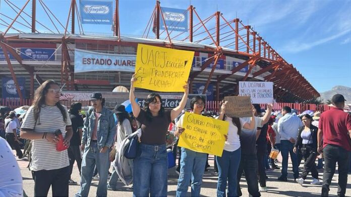 Estudiantes de la Universidad Autónoma de Ciudad Juárez (UACJ) se manifestaron este lunes a las afueras del Estadio Juárez, en vísperas del informe de gobierno de la presidenta Claudia Sheinbaum, con el objetivo de exigir mejoras en el transporte para los universitarios.