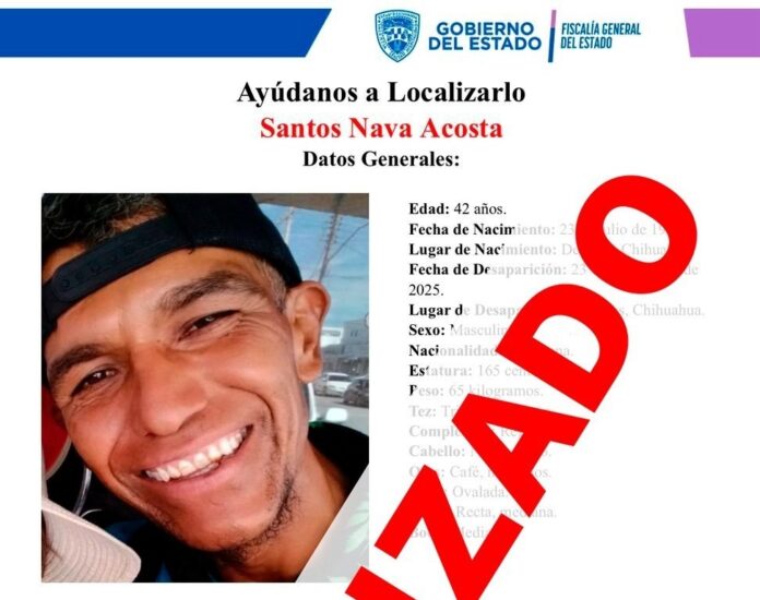 La Unidad de Investigación de Personas Ausentes y/o No Localizadas de la Fiscalía de Distrito Zona Centro (FDZC) localizó sano y salvo a Santos N. A., de 42 años, quien contaba con reporte de ausencia interpuesto en la ciudad de Delicias.