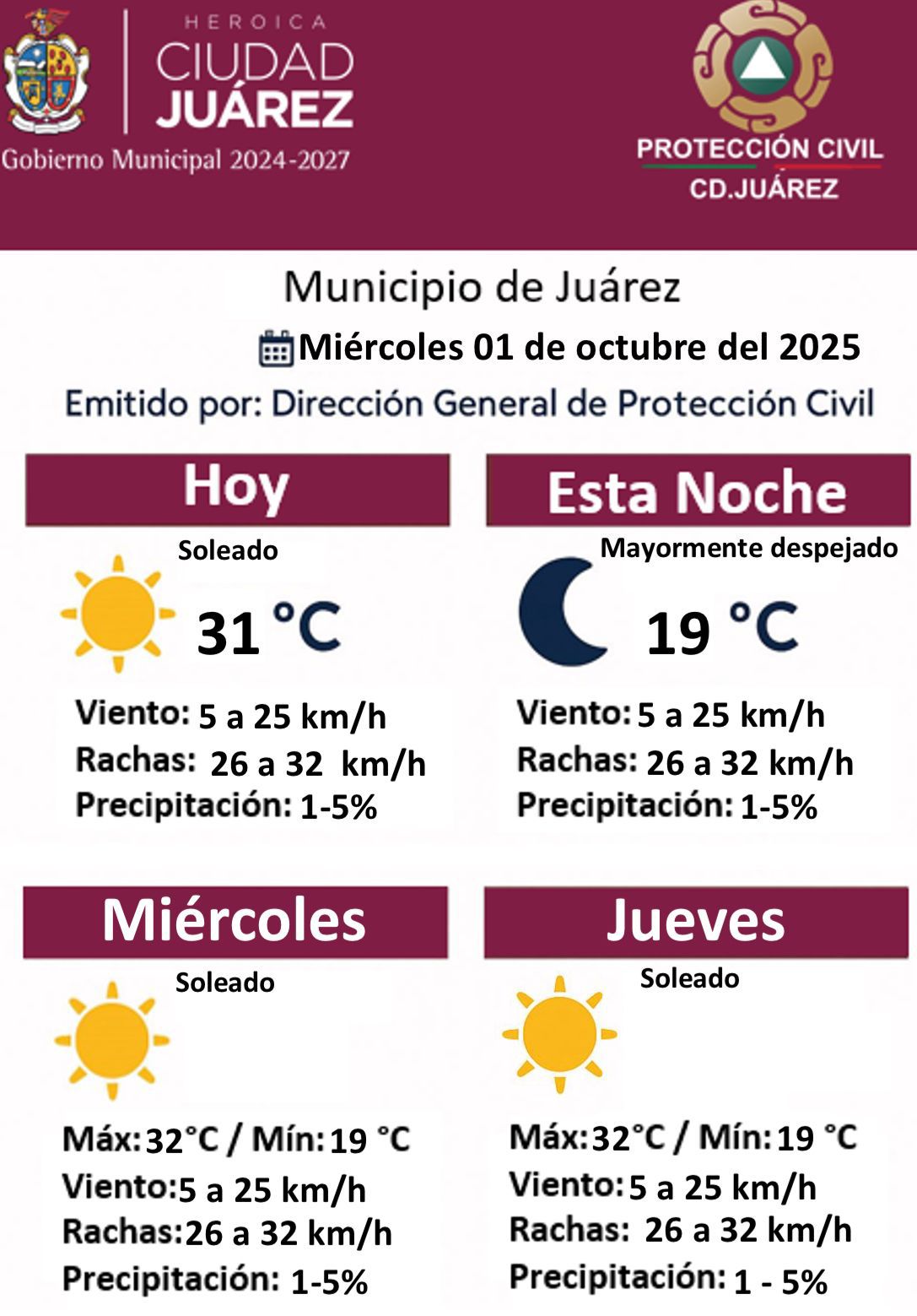 La Dirección General de Protección Civil del Municipio de Juárez informó las condiciones meteorológicas para este miércoles 1 de octubre de 2025.