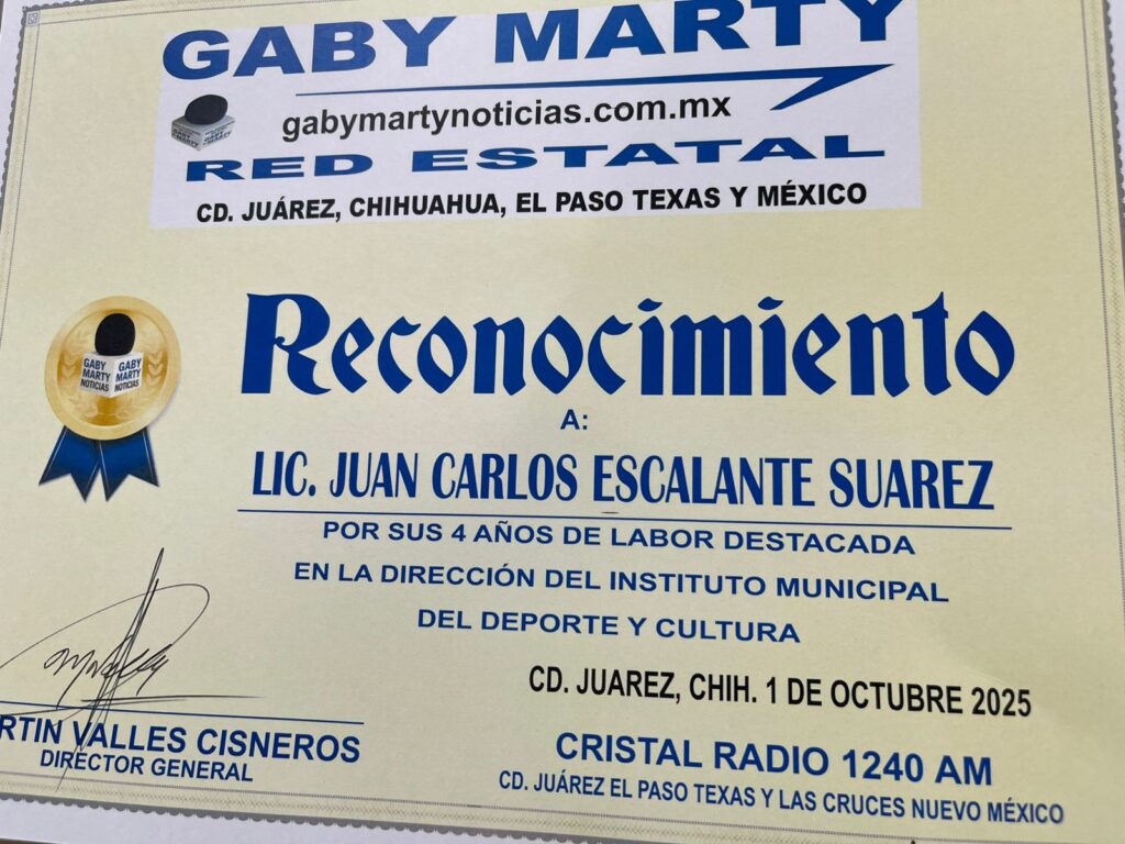 Este miércoles, el director del Instituto Municipal del Deporte y Cultura Física de Juárez (IMDEJ), Juan Escalante, recibió un reconocimiento por cuatro años de trabajo en la formación, promoción y apoyo a los deportistas de esta frontera.