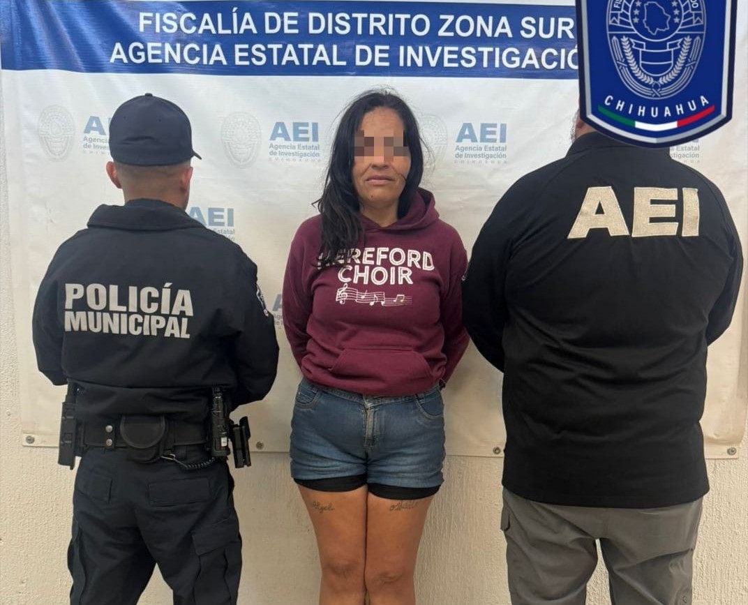 Elementos de la Agencia Estatal de Investigación (AEI) de la Fiscalía de Distrito Zona Sur, en conjunto con personal de la Dirección de Seguridad Pública Municipal de Parral, detuvieron a Karina Elizabeth M. S., quien contaba con una orden de aprehensión por el delito de violencia familiar.
