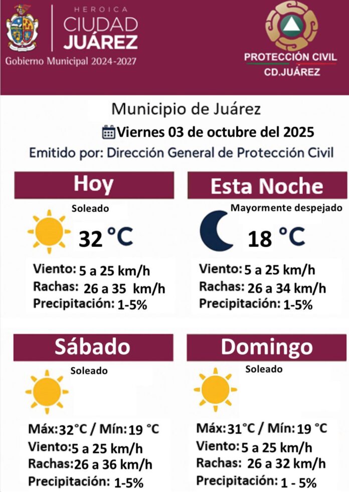La Dirección General de Protección Civil del Municipio de Juárez informó que este viernes 3 de octubre de 2025 se registrará un clima soleado con una temperatura máxima de 32 grados centígrados. El viento se mantendrá de 5 a 25 kilómetros por hora, con ráfagas de entre 26 y 35 km/h, y la probabilidad de precipitación será baja, de entre 1 y 5 por ciento.