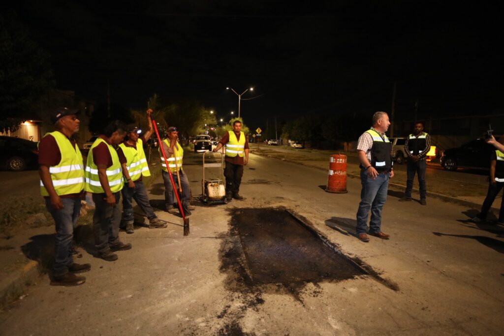 Como parte de las jornadas del programa de Brigadas especiales de bacheo, esta noche el Presidente Municipal, Cruz Pérez Cuéllar realizó una supervisión de actividad nocturna de bacheo en la avenida Valentín Fuentes, del tramo de avenida Ramón Rivera Lara a la avenida Ejército Nacional.