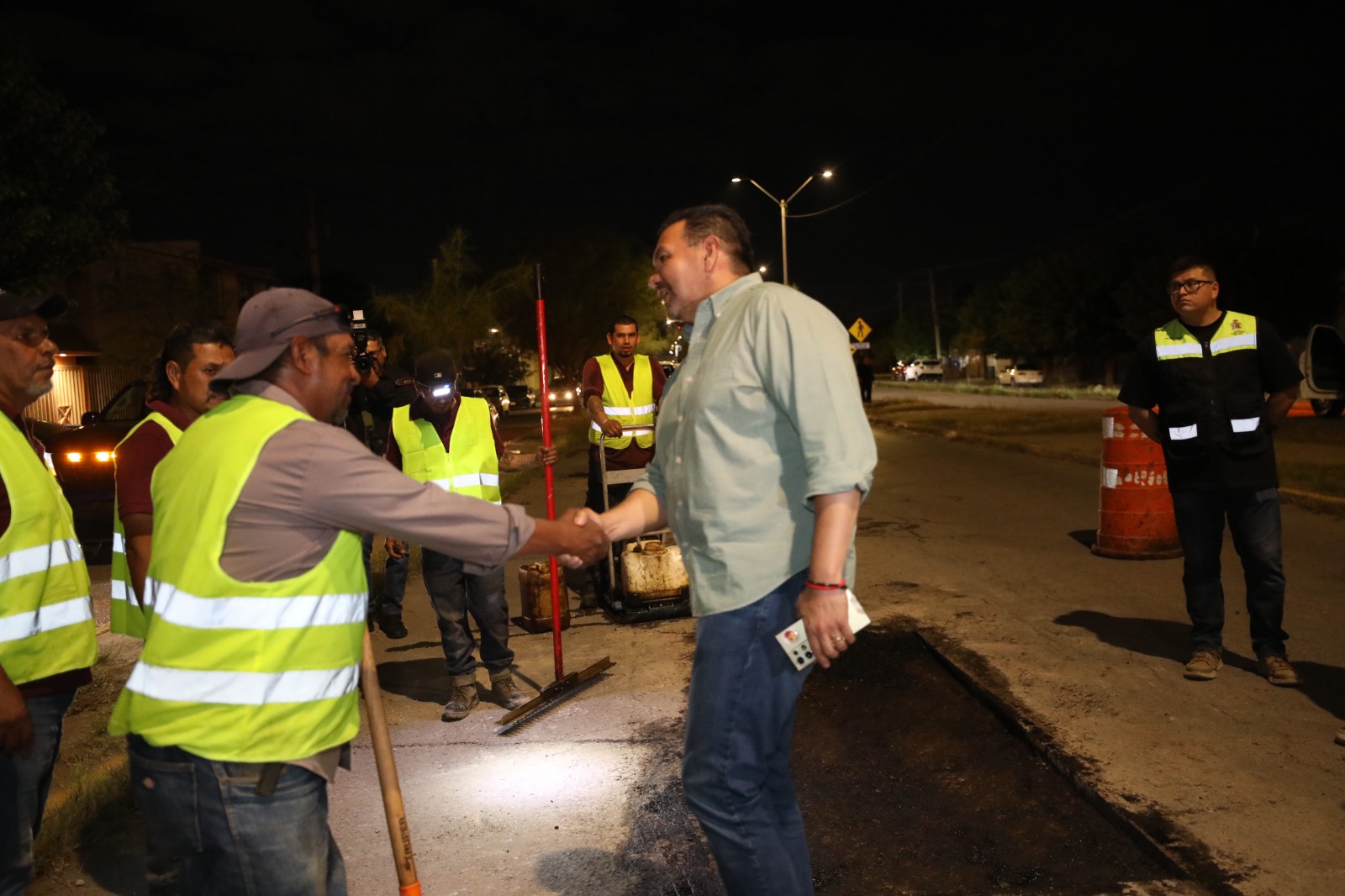 Como parte de las jornadas del programa de Brigadas especiales de bacheo, esta noche el Presidente Municipal, Cruz Pérez Cuéllar realizó una supervisión de actividad nocturna de bacheo en la avenida Valentín Fuentes, del tramo de avenida Ramón Rivera Lara a la avenida Ejército Nacional.