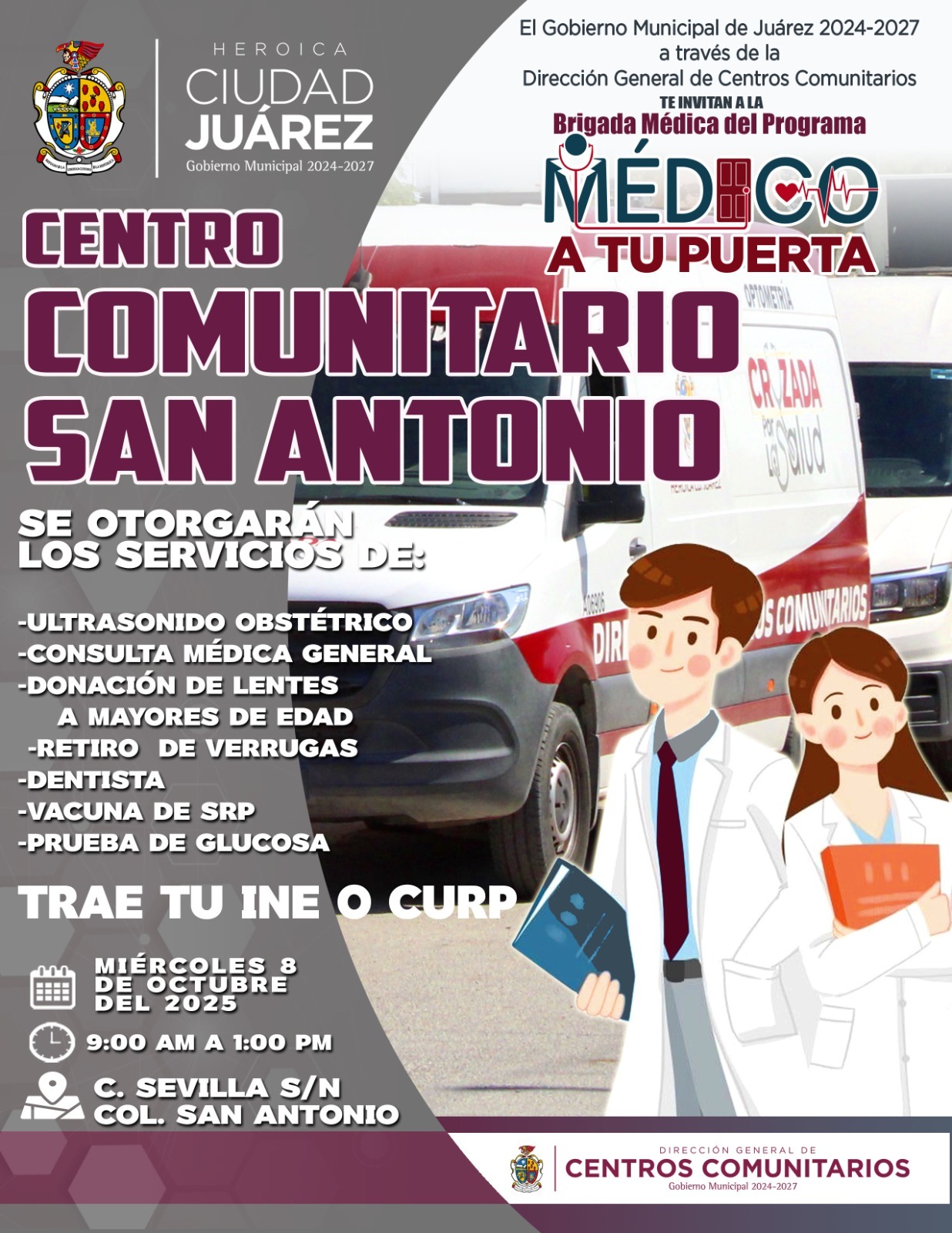 La Dirección General de Centros Comunitarios invita a la ciudadanía a la brigada del Programa Médico a Tu Puerta, en la colonia San Antonio.