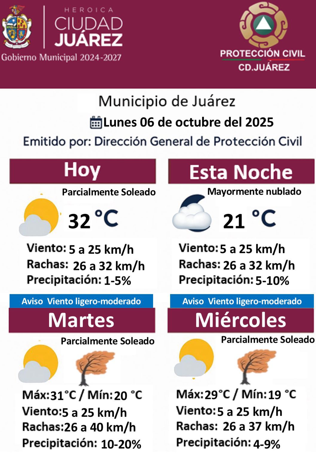 La Dirección General de Protección Civil del Municipio de Juárez informó que este lunes 6 de octubre de 2025 se mantendrán condiciones parcialmente soleadas, con una temperatura máxima de 32 °C y mínima de 21 °C por la noche, cuando el cielo se tornará mayormente nublado. Los vientos oscilarán entre 5 y 25 kilómetros por hora, con rachas de 26 a 32 km/h, y una ligera probabilidad de precipitación entre 1 y 10 %.