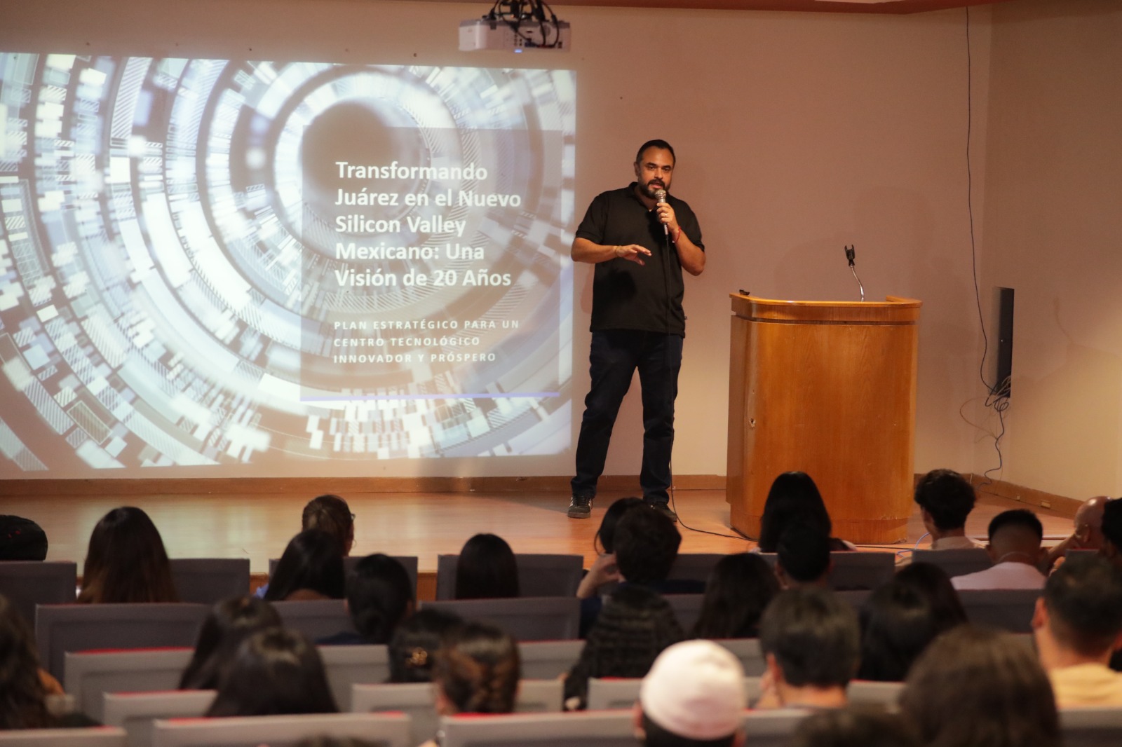 En la conferencia, el expositor habló a los estudiantes sobre cómo puede convertirse Ciudad Juárez en Siliicon Valley, cuya región de California tiene las mejores empresas de tecnología.