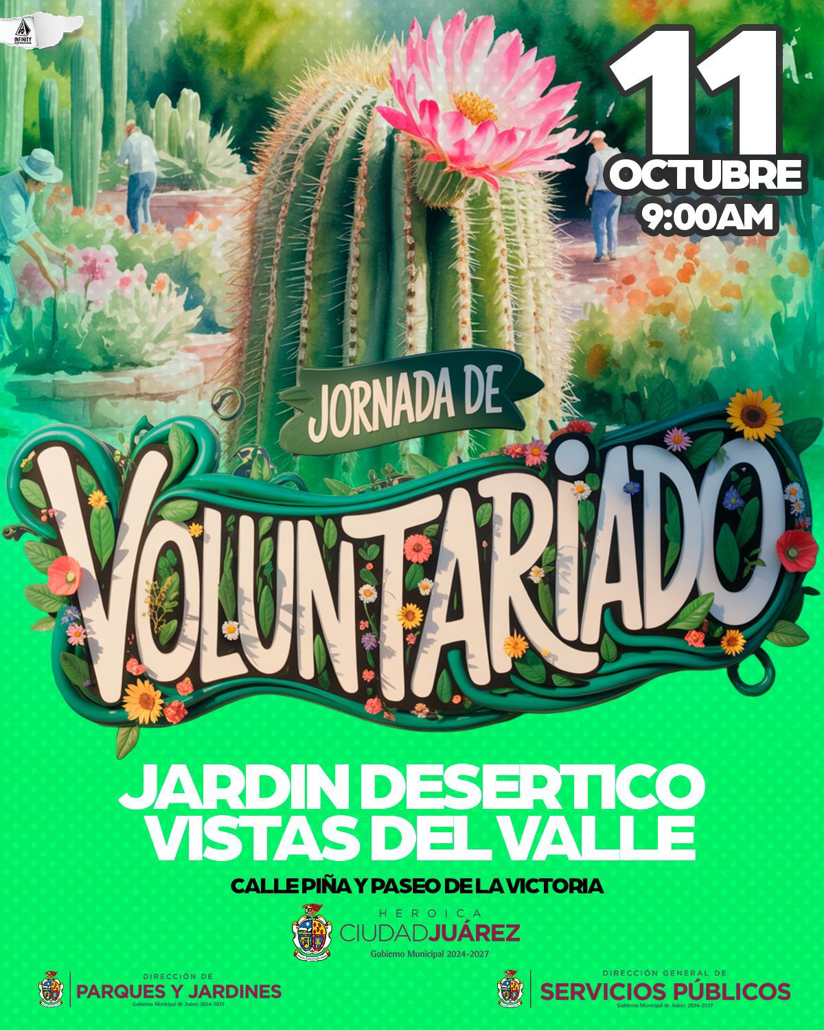 La Dirección de Parques y Jardines invita a la ciudadanía a participar en la próxima jornada de voluntariado que se llevará a cabo el próximo sábado 11 a partir de las 9:00 de la mañana, en el Jardín Desértico Vistas del Valle, situado en el cruce de Paseo de la Victoria y calle Piña.