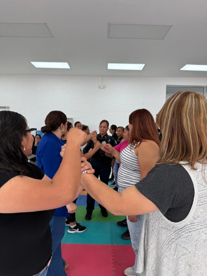 La capacitación fue impartida por instructoras de la Secretaría de Seguridad Pública Municipal, quienes enseñaron técnicas básicas para prevenir situaciones de riesgo, reaccionar ante posibles agresiones y fortalecer la seguridad y confianza personal de las participantes.