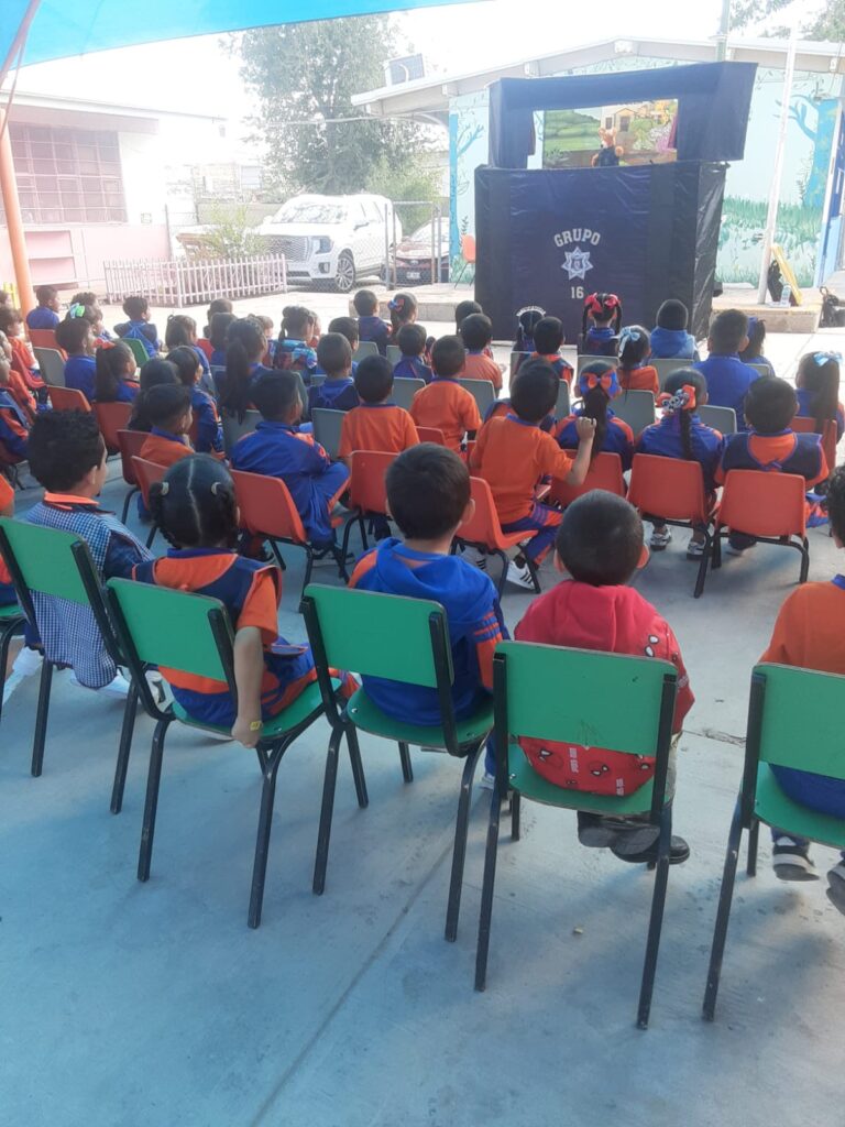 En esta ocasión los elementos acudieron al plantel educativo ubicado en el cruce de las calles Cuarta y Rene Mascareñas Miranda, en la colonia Torres del Sur, donde a través de los personajes que conforman el Teatrino se ofreció una función a los pequeños, quienes interactuaron gustosos con los oficiales.