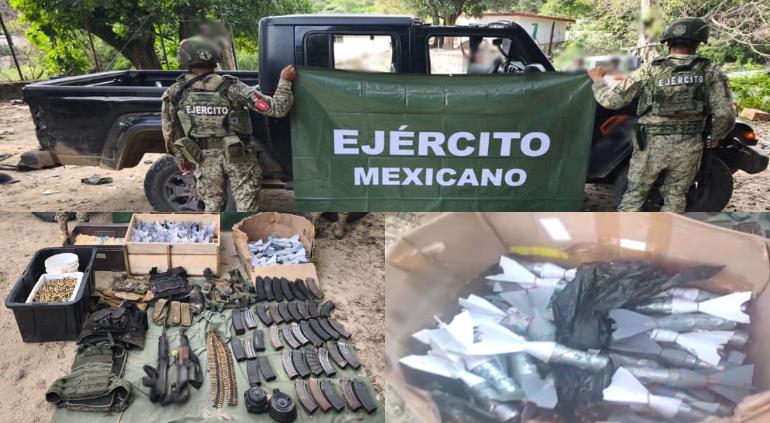 Elementos del Ejército llevaron a cabo el aseguramiento de una camioneta Jeep que estaba abandonada y cargada con un arsenal y explosivos.