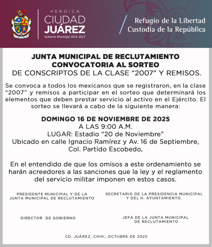 HomeREGIONALESJuárezLa Junta Municipal de Reclutamiento convoca al sorteo de conscriptos de la...