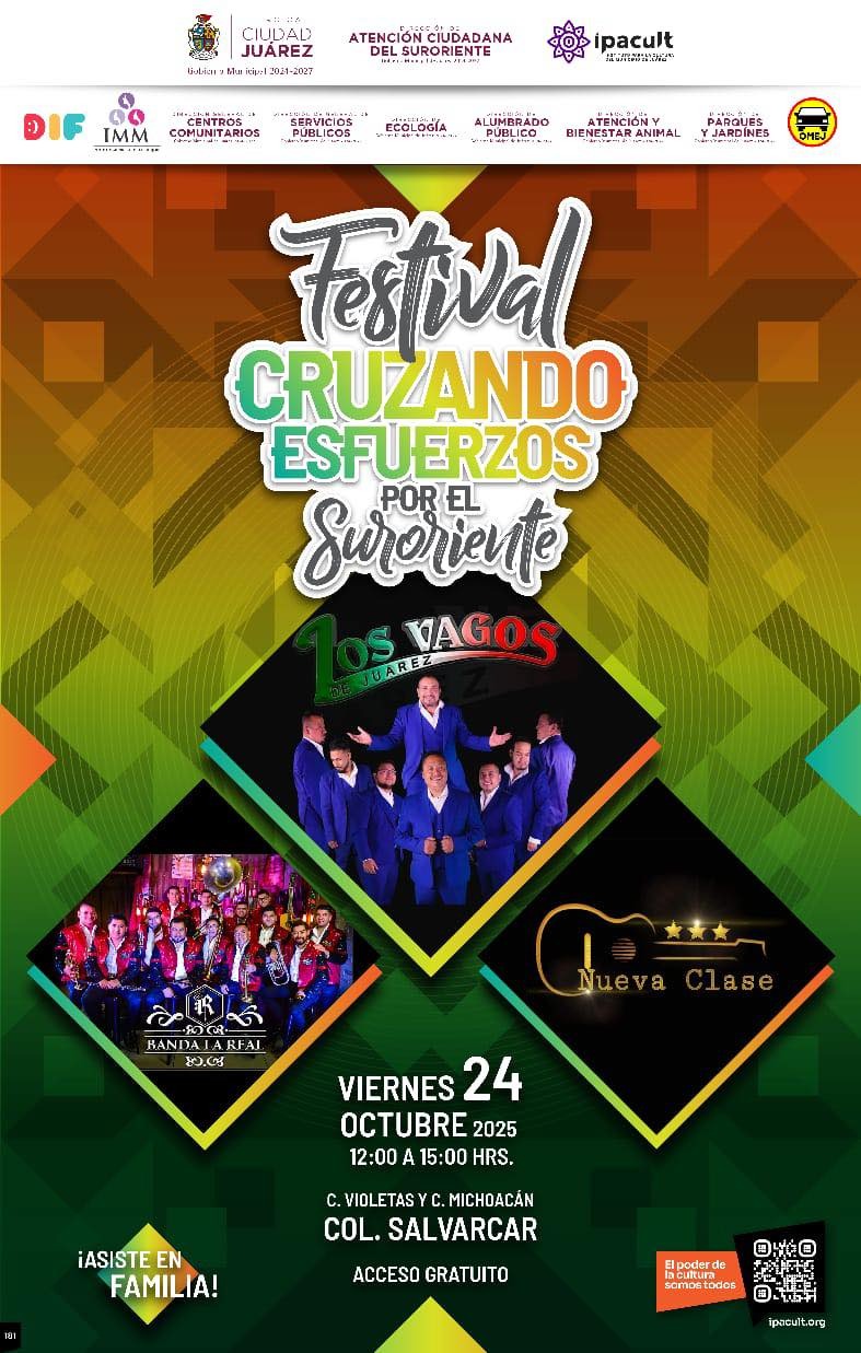Los asistentes también podrán disfrutar de la presentación musical de las bandas La Real de Ciudad Juárez, Nueva Clase y Los Vagos de Juárez.