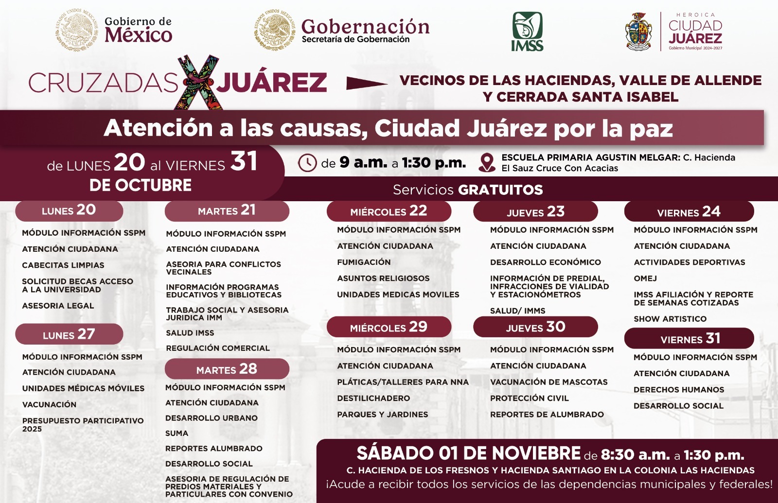 El próximo sábado 1 de noviembre se llevará a cabo el programa Cruzadas por Juárez, Atención a las Causas, Ciudad Juárez por la Paz en la colonia Las Haciendas, en la calle Hacienda de los Fresnos y Hacienda Santiago de 8:30 de la mañana a 1:30 de la tarde.