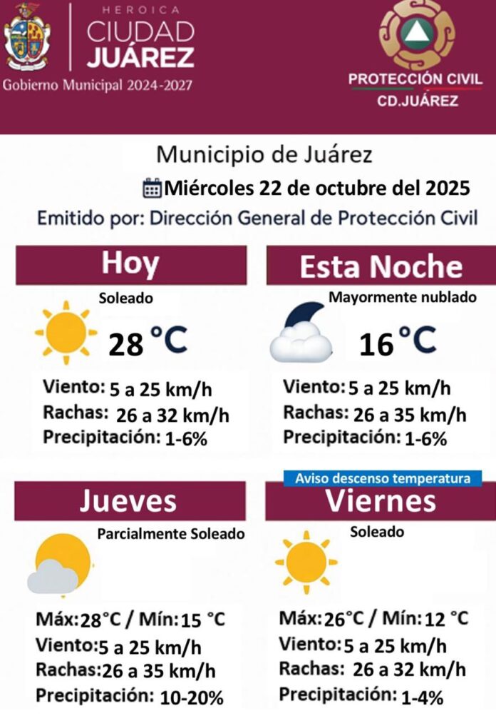 La Dirección General de Protección Civil del Gobierno Municipal informó que este miércoles 22 de octubre se espera un día soleado con temperatura máxima de 28 °C y mínima de 16 °C durante la noche.