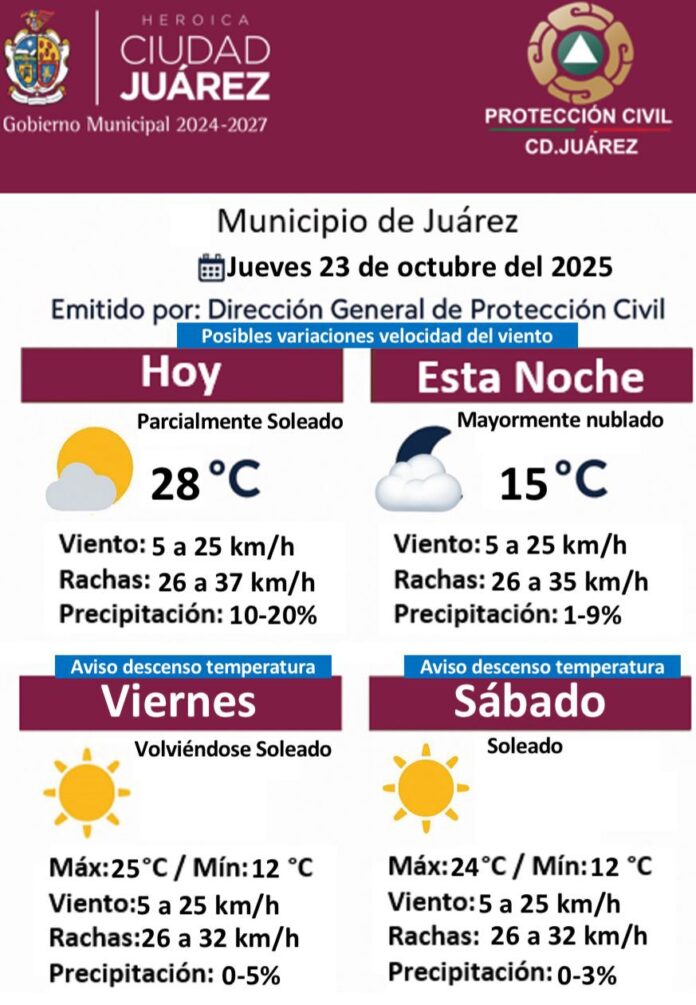 La Dirección General de Protección Civil del Gobierno Municipal informó que para este jueves 23 de octubre se espera un clima parcialmente soleado, con una temperatura máxima de 28 grados centígrados. El viento se mantendrá de 5 a 25 kilómetros por hora, con rachas de 26 a 37 km/h, y una probabilidad de precipitación entre 10 y 20 por ciento.