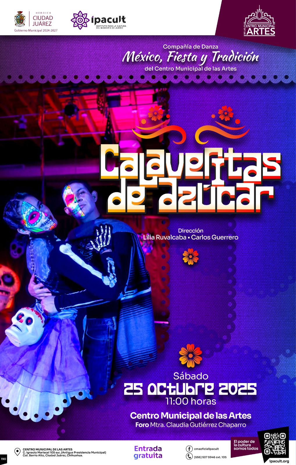 El espíritu de las tradiciones mexicanas cobrará vida este sábado 25 de octubre en el foro Mtra. Claudia Gutiérrez Chaparro del Centro Municipal de las Artes (CMA), donde el Instituto para la Cultura del Municipio de Juárez (IPACULT) presentará de manera gratuita el espectáculo de danza “Calaveritas de Azúcar”. La función comenzará a las 11:00 de la mañana.