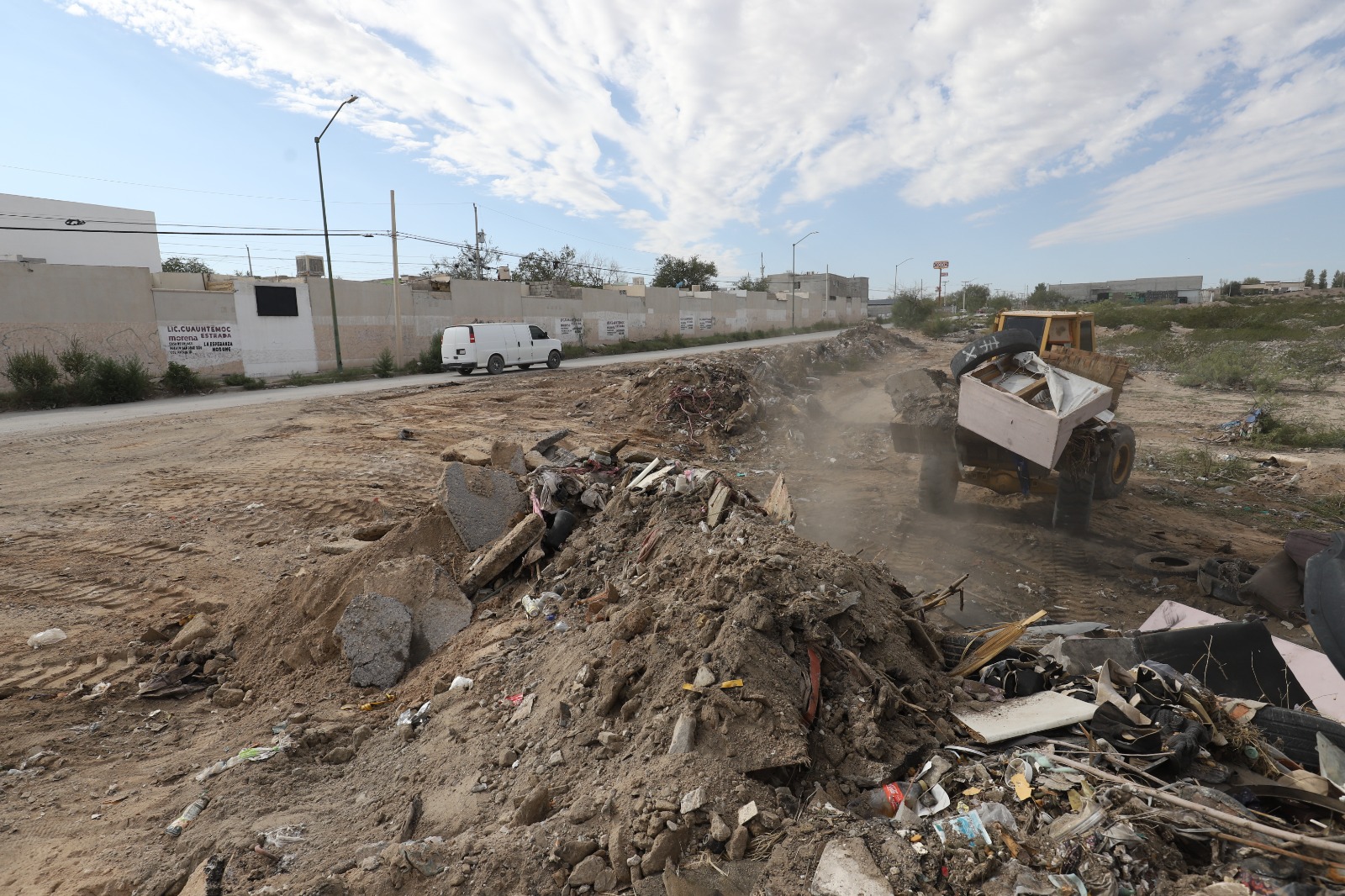 En atención a una solicitud ciudadana realizada directamente al Presidente Municipal, Cruz Pérez Cuéllar, durante la más reciente Cruzada por las Causas de Juárez, la Dirección de Limpia llevó a cabo labores de limpieza en un predio baldío ubicado sobre la calle Puerto Obaldía, donde se detectó una acumulación importante de residuos.