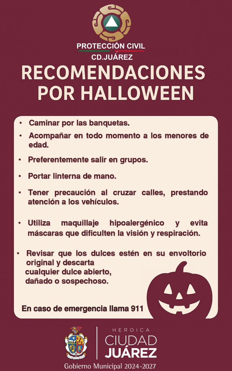 La Dirección General de Protección Civil del Gobierno Municipal emitió una serie de recomendaciones para que las familias juarenses disfruten de un Halloween seguro, especialmente al participar en actividades de “dulce o truco” en calles y colonias por distintos puntos de la ciudad.