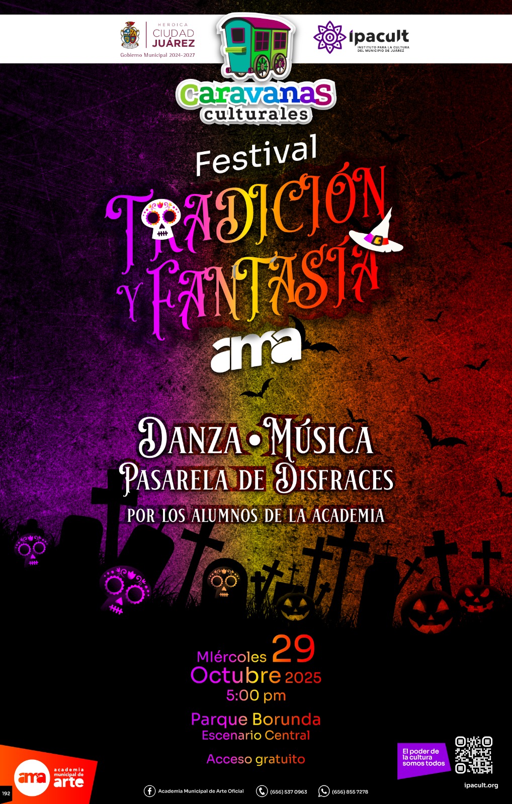 Como parte del programa Caravanas Culturales, el Instituto para la Cultura del Municipio de Juárez (IPACULT) invita a la comunidad juarense al Festival de Tradición y Fantasía, organizado por la Academia Municipal de Arte (AMA), que se llevará a cabo este miércoles 29 de octubre a las 5:00 de la tarde en el Parque Borunda.