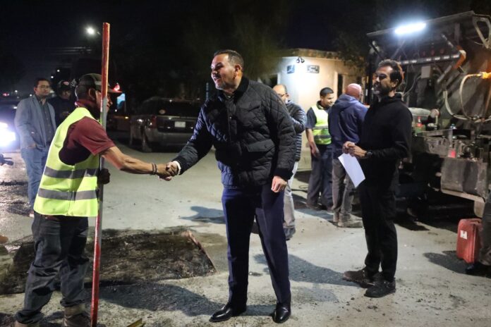 Esta noche el Presidente Municipal Cruz Pérez Cuéllar realizó una supervisión nocturna de trabajos de bacheo en la calle Venezuela y Aguilar Sáenz en la colonia Melchor Ocampo.