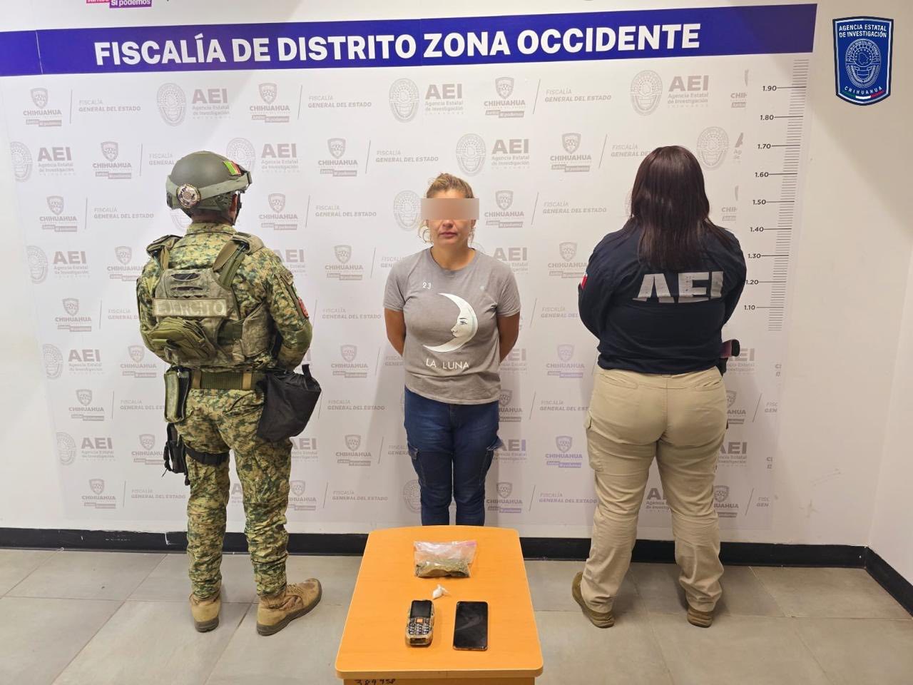 En seguimiento a una investigación ministerial por el delito de robo, elementos de la Agencia Estatal de Investigación, detuvieron a una mujer en posesión de mariguana y cristal, durante el cateo a un domicilio de la colonia La Cima, en la ciudad de Cuauhtémoc.