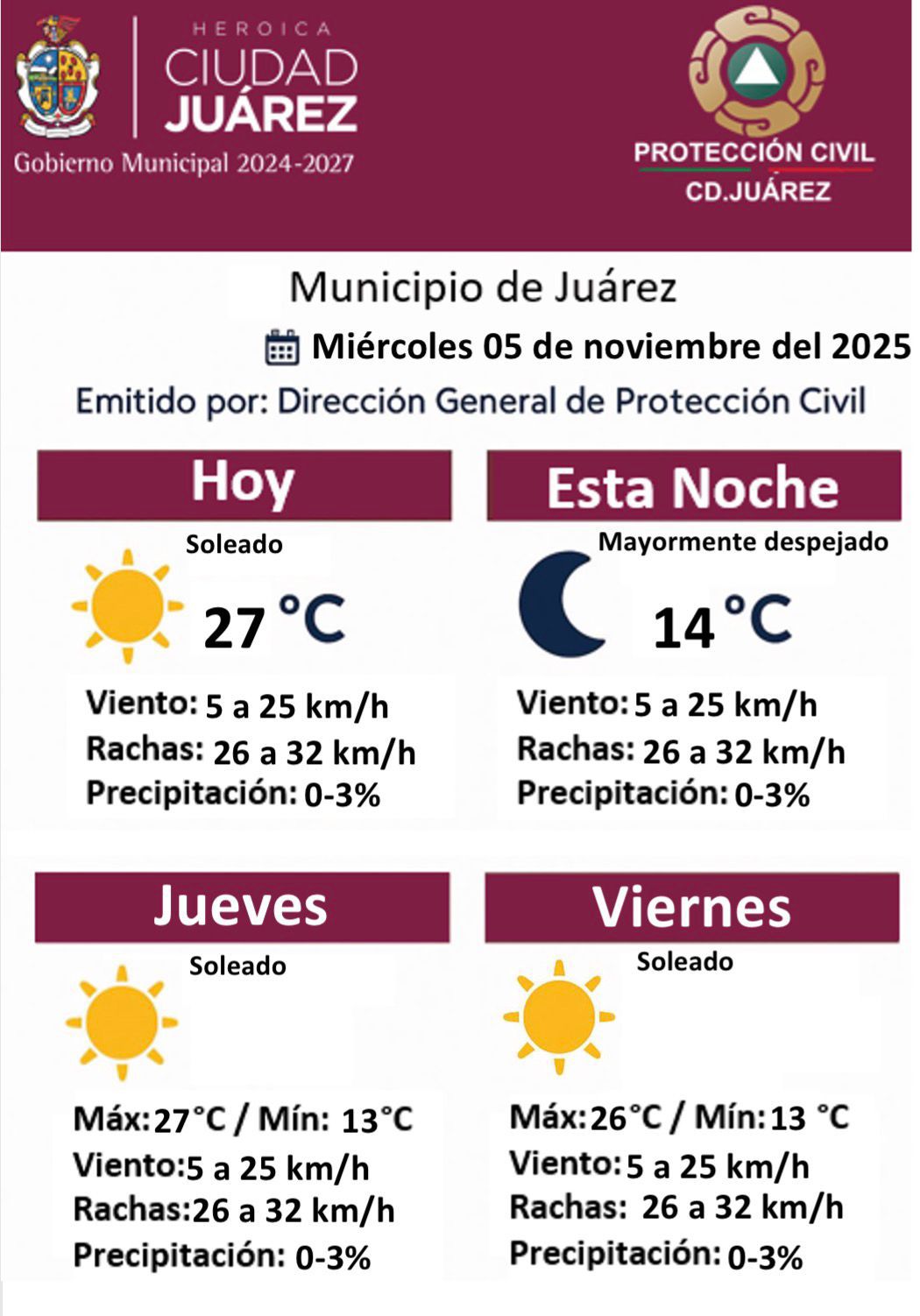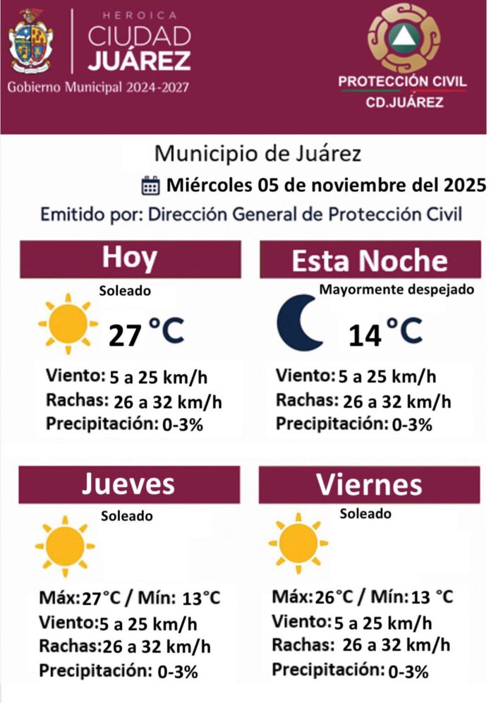 La Dirección General de Protección Civil informó que este miércoles 5 de noviembre se espera un día soleado en Ciudad Juárez, con una temperatura máxima de 27 °C y mínima de 14 °C durante la noche, condiciones mayormente despejadas y sin probabilidad significativa de lluvia.