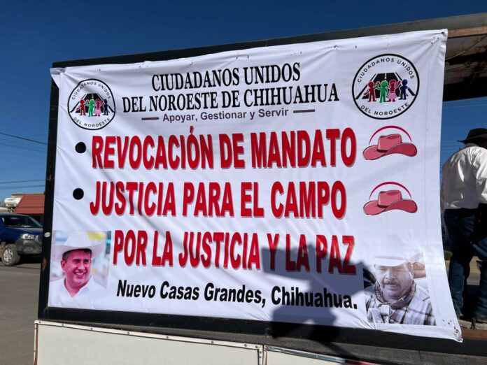 Portando una lona gigante en la que plasma la leyenda “Revocación de Mandato” y “Justicia para el Campo”, además de las fotos de Carlos Manzo alcalde de Uruapan asesinado a inicio de este mes, y del malogrado líder campesino de Nuevo Casas Grandes Armando Villarreal Marta, cientos de productores de la zona noroeste del estado marcharon esta tarde a bordo de autos, tractocamiones, tractores, caballos, razers y en carretas.