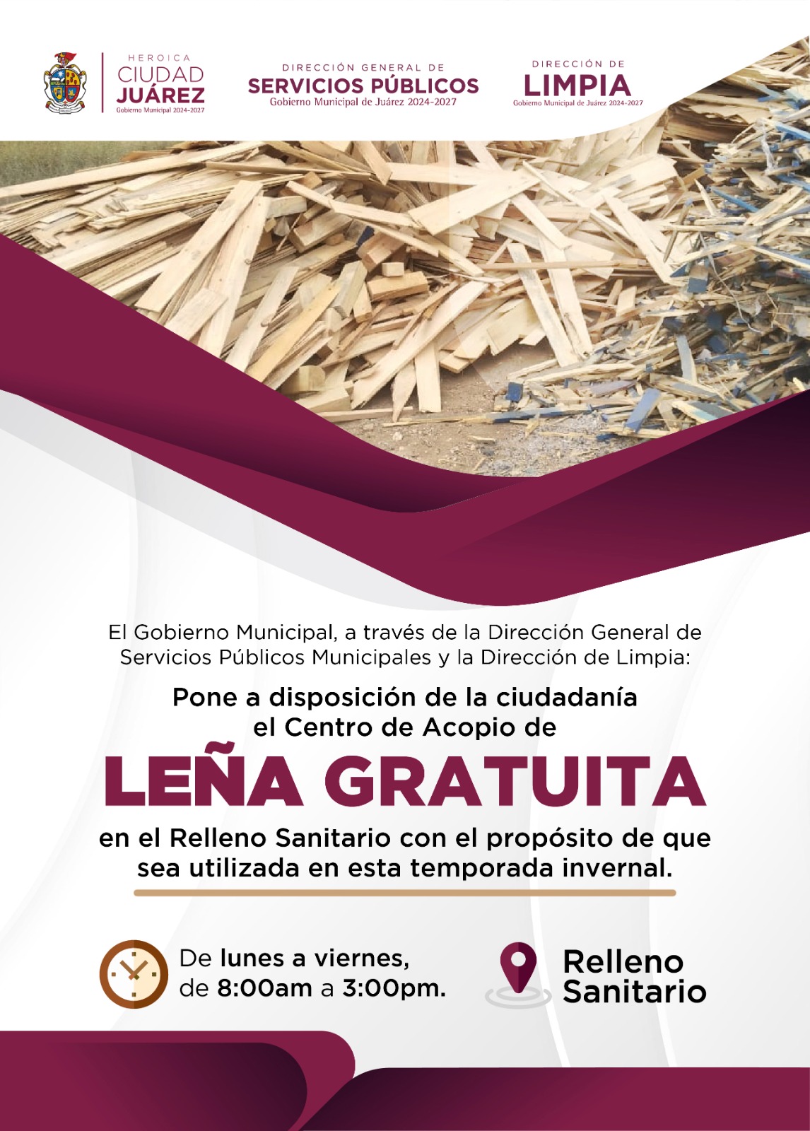 El titular de la dependencia, Gibran Solís Kanahan, señaló que debido a que en la temporada invernal mucha gente utiliza la madera para mitigar el frío, invita a los juarenses a acudir de lunes a viernes, de 8:00 de la mañana a 3:00 de la tarde para recoger la leña.