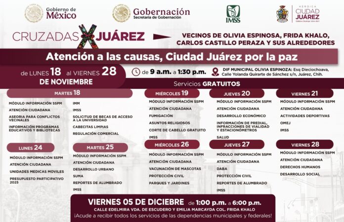 El próximo viernes 5 de diciembre se llevará a cabo el programa “Cruzadas por Juárez, Atención a las Causas, Ciudad Juárez por la Paz”, en la calle Edelmira Viuda de Escudero y Emilia Marcayda en la colonia Frida Kahlo de 1:00 a 6:00 de la tarde.