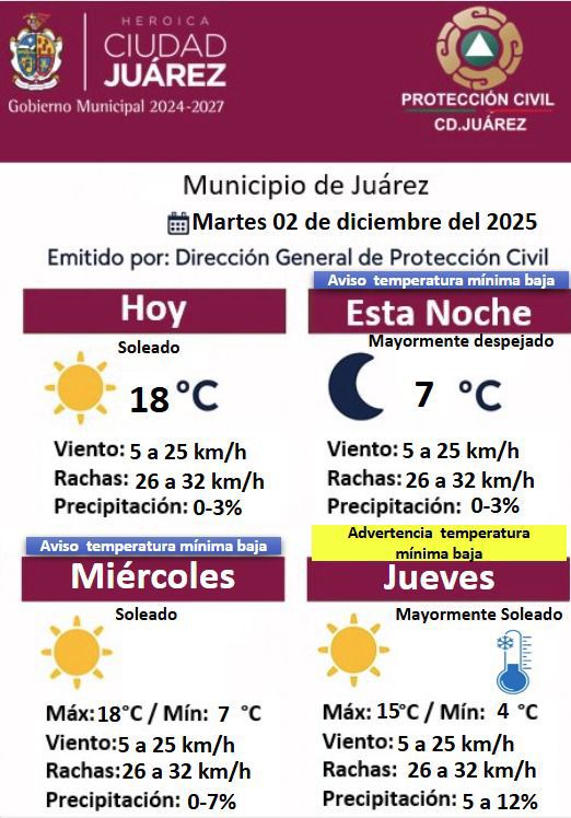 La Dirección General de Protección Civil del Municipio de Juárez informó el pronóstico del clima para este martes 2 de diciembre de 2025, así como las condiciones esperadas para los próximos días. Para hoy se prevé un cielo soleado con una temperatura máxima de 18 grados centígrados. El viento oscilará entre 5 y 25 kilómetros por hora, con rachas que podrían alcanzar de 26 a 32 kilómetros por hora y una probabilidad de precipitación entre 0 y 3 por ciento.